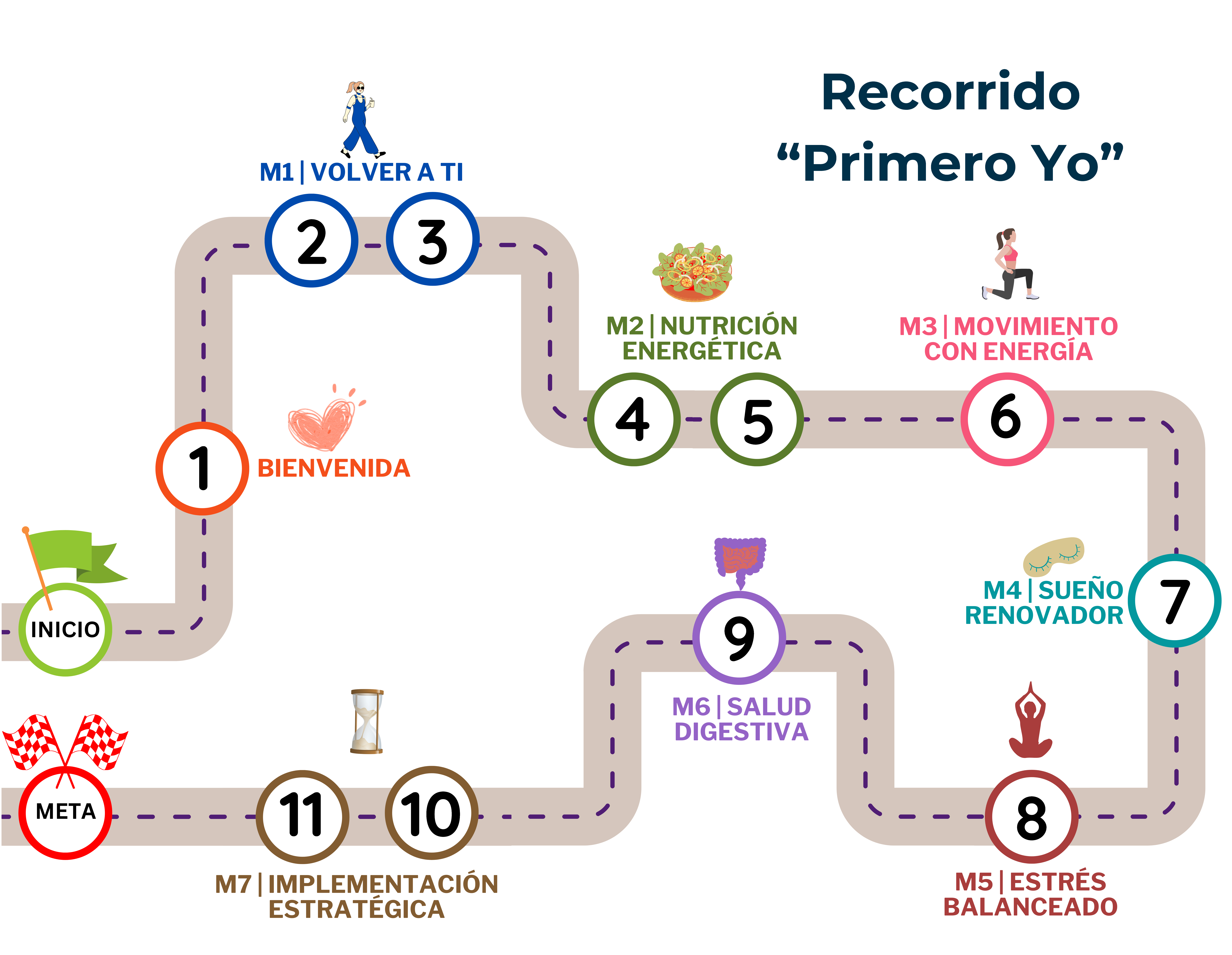 El recorrido Primero Yo no es un curso teórico: Es una ruta paso a paso que te acompaña a hacer ajustes conscientes en tu salud, en tu forma de priorizarte y en cómo aprovechar mejor tu día.