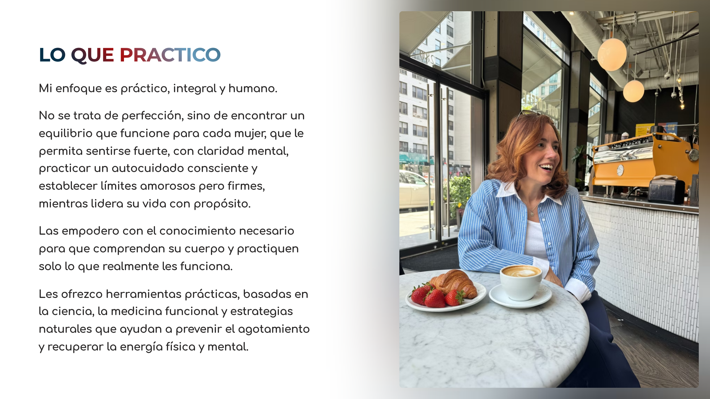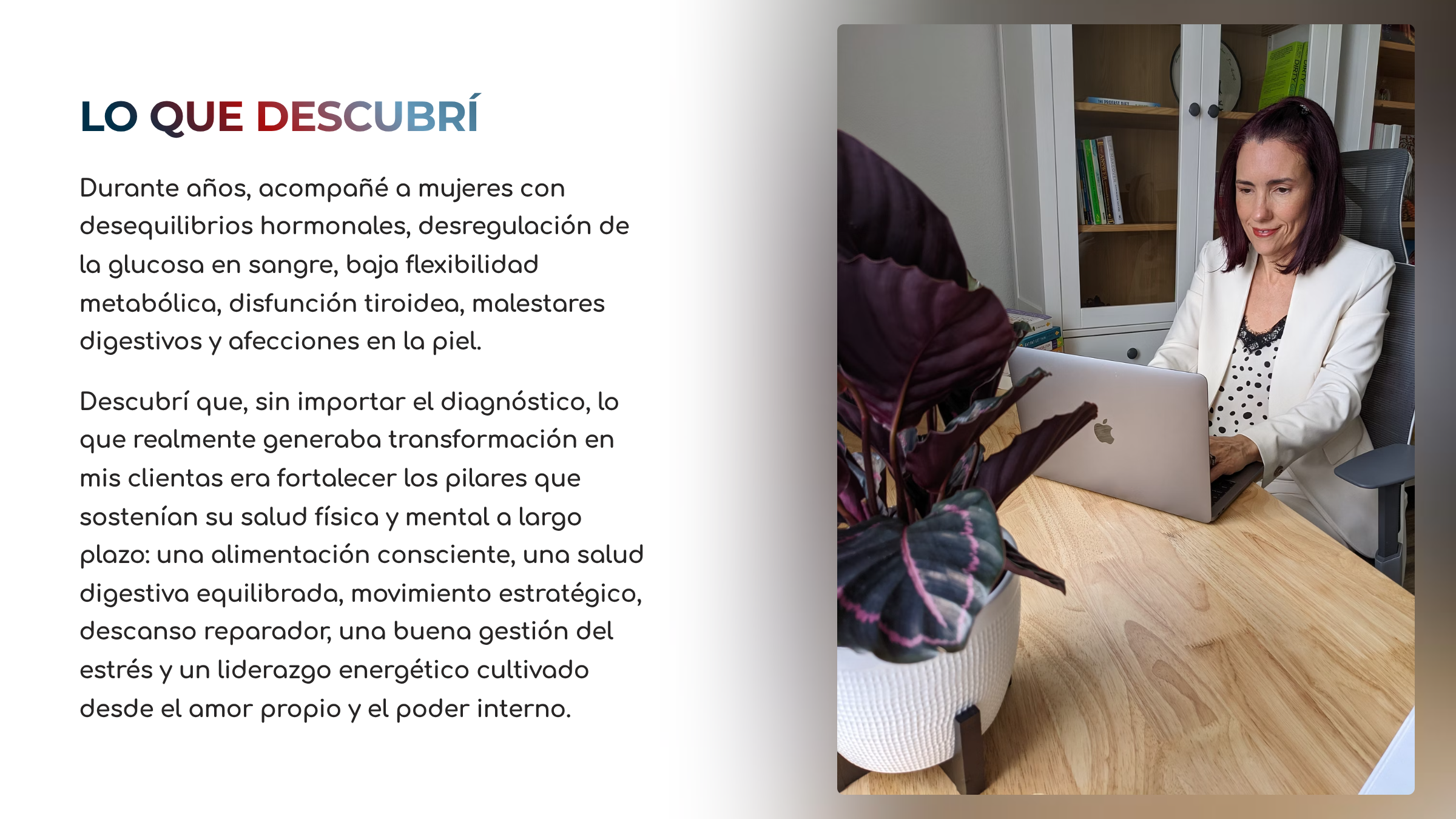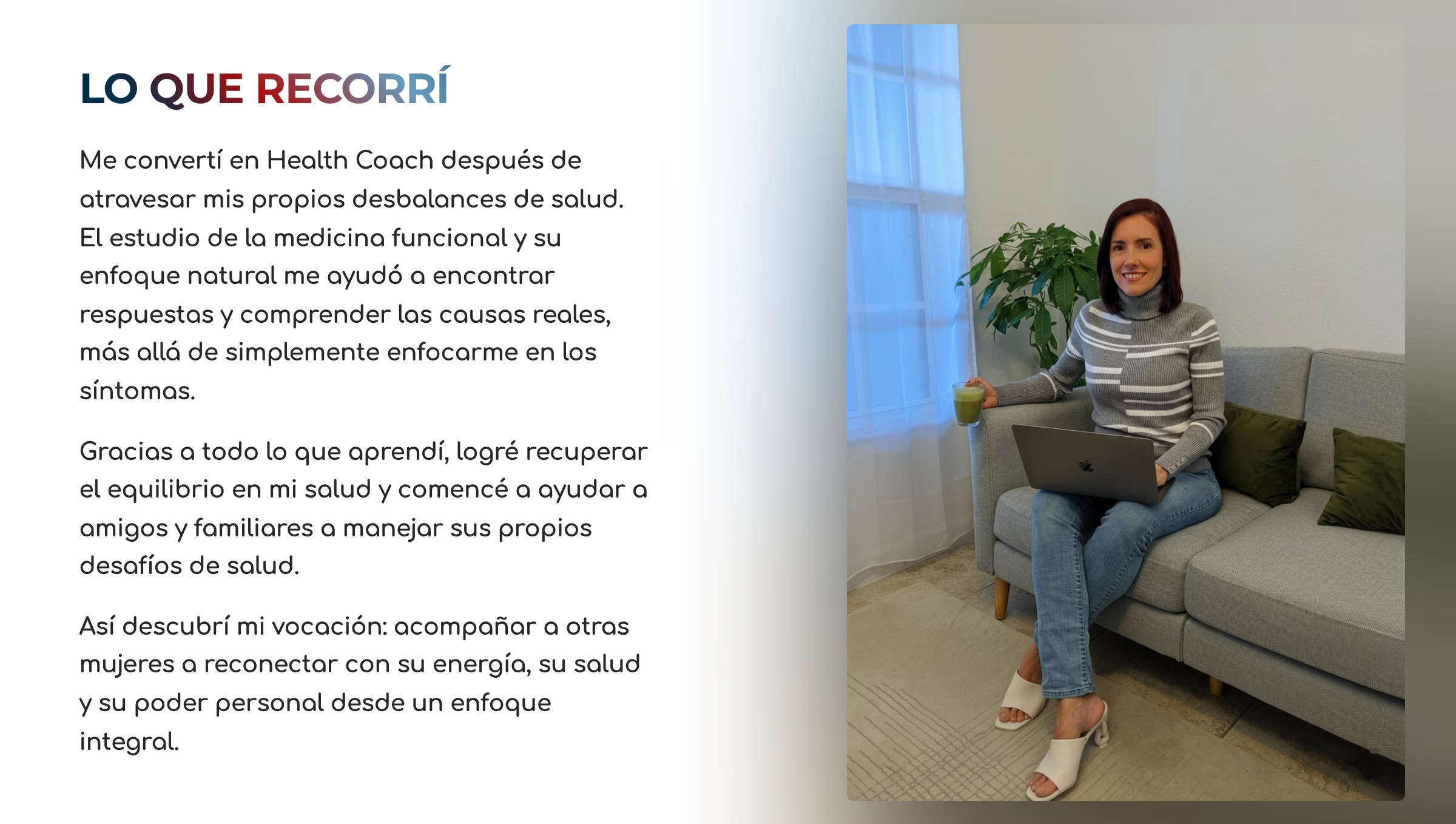 Agradezco cada paso de mi camino, porque no solo me formé en salud funcional y holística, sino que desarrollé la resiliencia y la confianza interior necesarias para acompañar a mis clientas con claridad y profundidad