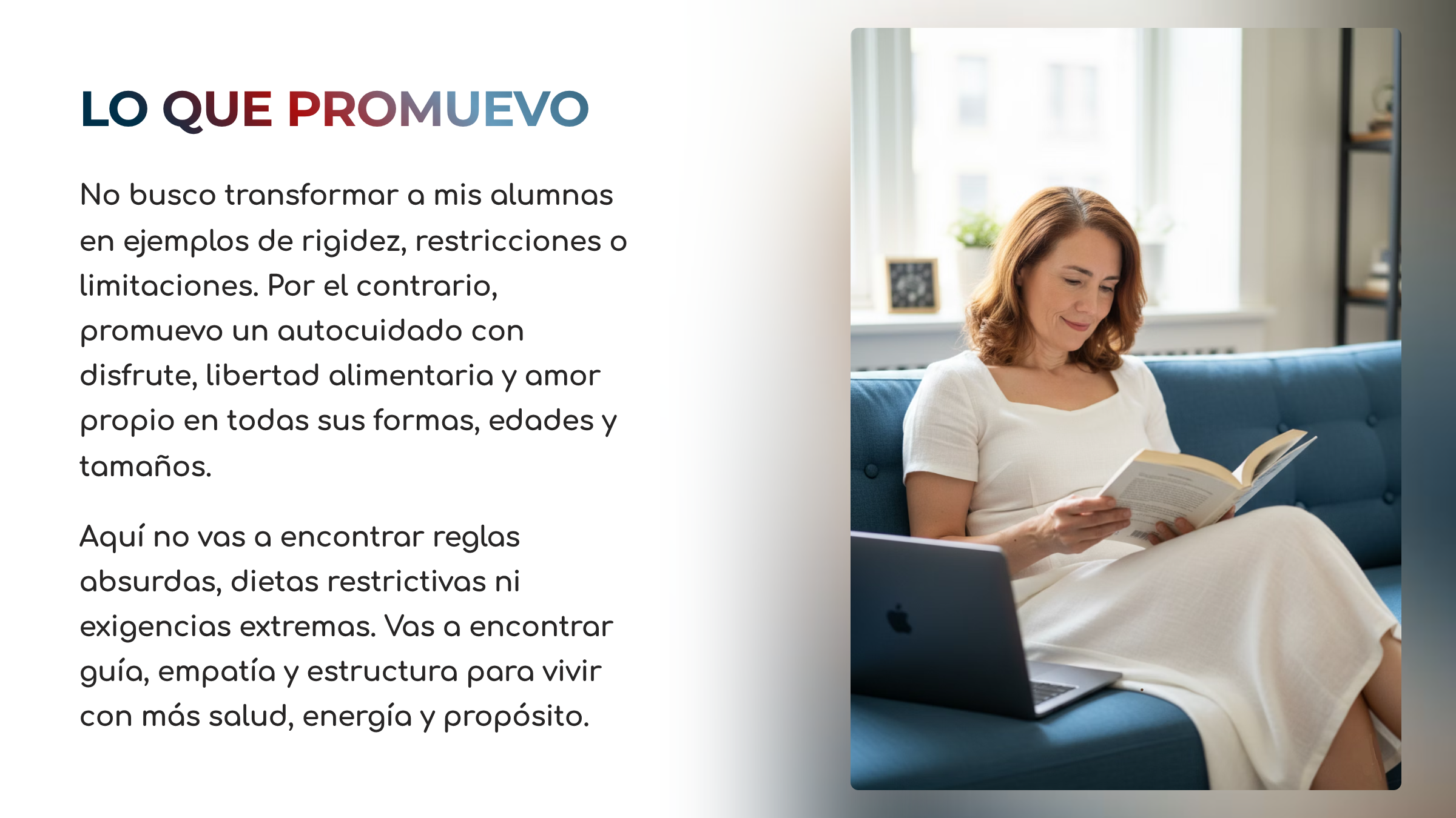 Con mi acompañamiento, mis alumnas diseñan su propio plan práctico, personalizado y sostenible, para cuidar su cuerpo con intención, coherencia y desde el conocimiento.